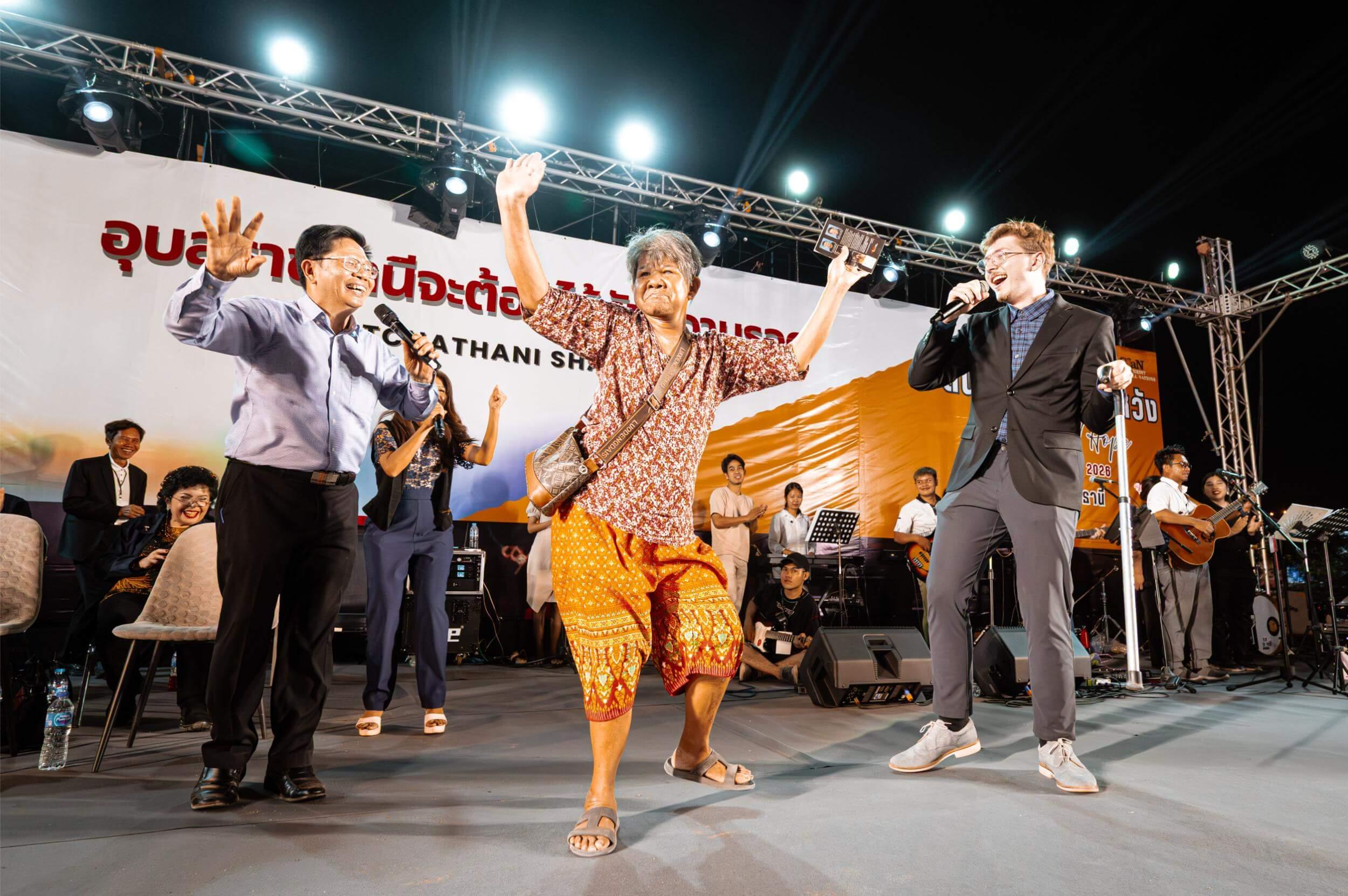 During testimony time, I met an older woman named Sommai, who for 2 years suffered from severe pain, unable to move her back. She said she had a herniated disc on the right side. However, when we prayed in the mighty name of Jesus, all that pain left her body. Upon asking her to rate the pain, she said that before it was a 10/10. But now, that pain has reduced to a zero. She said happily, “Jesus healed me!” We went on to dance on stage, throwing her cane away as she had no use of it any longer.