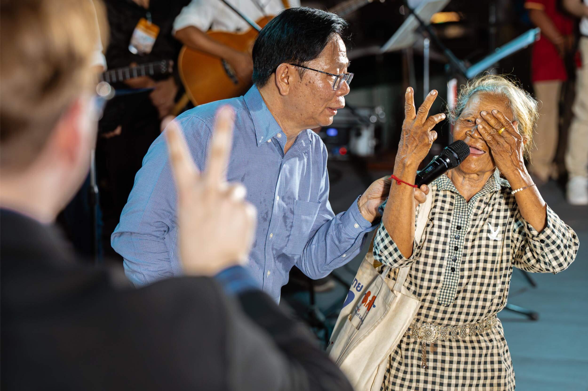 Another testimony we received that night was of a lady named Yay Bunrot. When we asked her what was wrong in her body, she said both of her eyes were blind, with the right eye being completely blind, and the left partially so. But now, she was claiming she could see perfectly! Though she had already exhibited her healing by telling everyone how handsome I was in the microphone (that really happened, ha ha!), I decided to still test it on stage. I stood further away, holding up finger numbers for her to call out. I had her cover the left eye and use only the right eye, formerly completely blind. With each test, she could see the number clearly and called it out to the crowd.